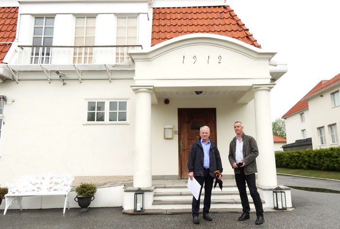 Anders Boström och Jens Frejrud framför huvudbyggnaden.