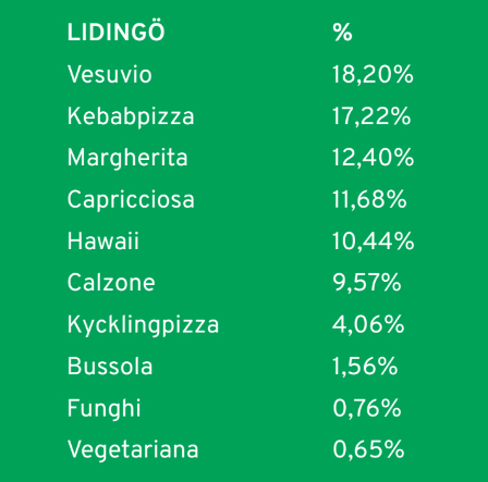 På Lidingö var Vesuvio den mest populära enligt Onlinepizzas undersökning. Så här såg den lokala "Tio-i-toppen" ut: